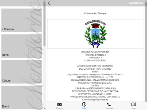 Attraverso lAPP potrai scoprire servizi, eventi, ospitalità, specialità gastronomiche....di facile consultazione lapplicazione crea un filo diretto con il mondo di Montefiorino!!!!