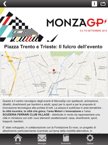 descrizione app (fammi sapere se è troppo lungo): MonzaGp è l’evento che si svolge in occasione del Gran premio di Formula 1, l’appuntamento sportivo e turistico più importante per la città di Monza e la Brianza. Motori, divertimento e uno sguardo al futuro: queste sono le parole chiave di MonzaGp, evento organizzato dal Comune di Monza in collaborazione con Lab[u] dal 5 all’8 settembre 2013.
