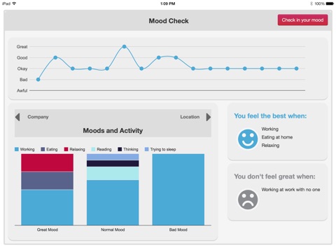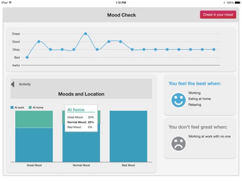 MoodCheck will send reminders that will encourage you to track your mood and activities throughout the day. Determining what activities make you happy will help you change your behaviour and help you avoid activities that decrease your mood.