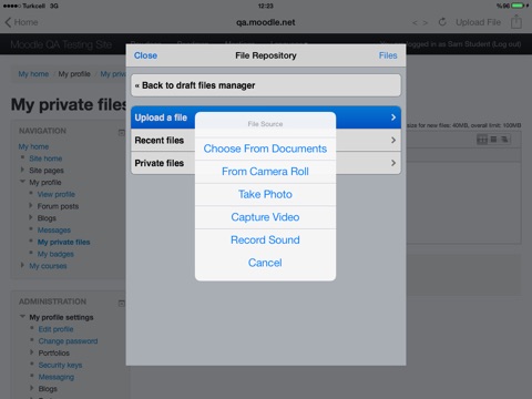 moodlEZ (MoodleEasy) is a specialized Moodle web browser app with file upload support. MoodleEZ also supports file downloads from your Moodle site to your device.