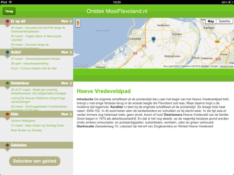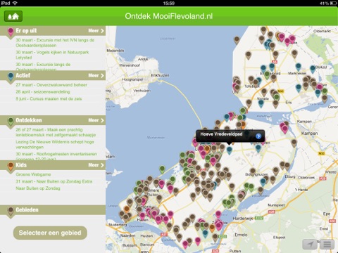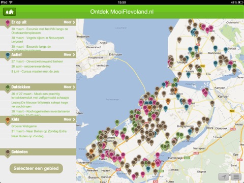Flevoland kent een jonge en verrassende natuur. Er valt veel te ontdekken. De app MooiFlevoland geeft een overzicht van activiteiten en excursies en prachtige gebieden in Flevoland. Ben je op zoek naar een leuke activiteit in de natuur? Open de app en kijk wat er in jouw omgeving wordt aangeboden door de diverse organisaties waarmee we samenwerken.