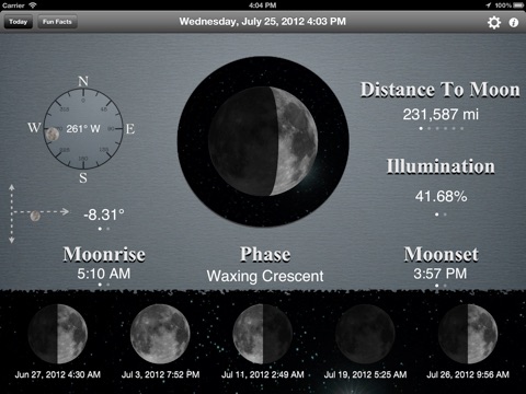 This is a very good app but it needs an upgrade so that you can add the first and last quarter and waxing and waning crescent and gibbous to you calendar because I like knowing when those fazes are happening. Therefore, until they add the option to add those to your calendar through the app like the new and full moon, Ill not be granting them three stars.
