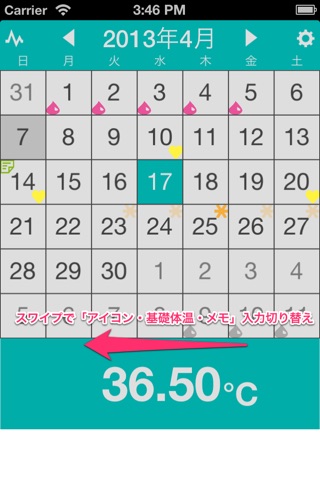 ・基礎体温の記録(画面下エリアをスワイプして体温表示エリアをタップ)