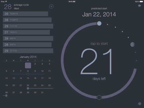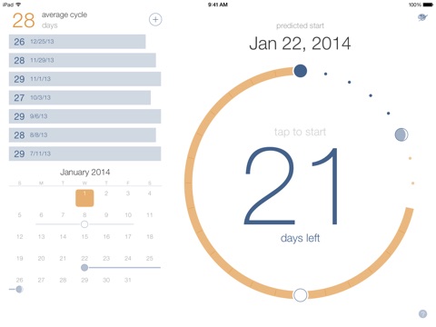 * The progress dial shows the current cycle and the estimated number of days until the next period start.