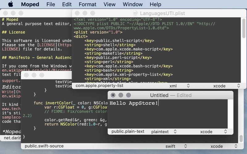 Moped intends to give a Windows Notepad feel, while being a full native of macOS, with a touch of modern syntax highlight and themes.