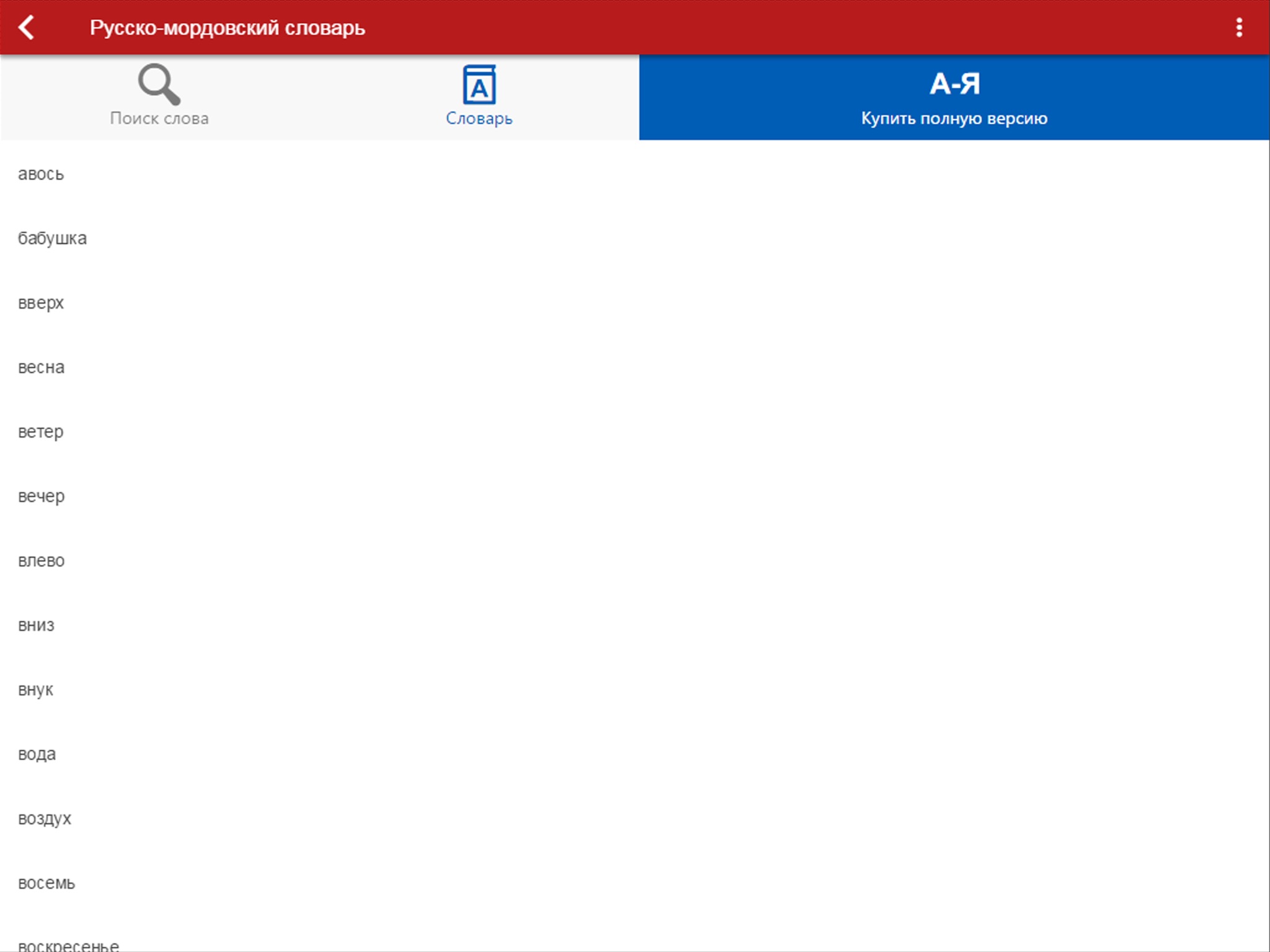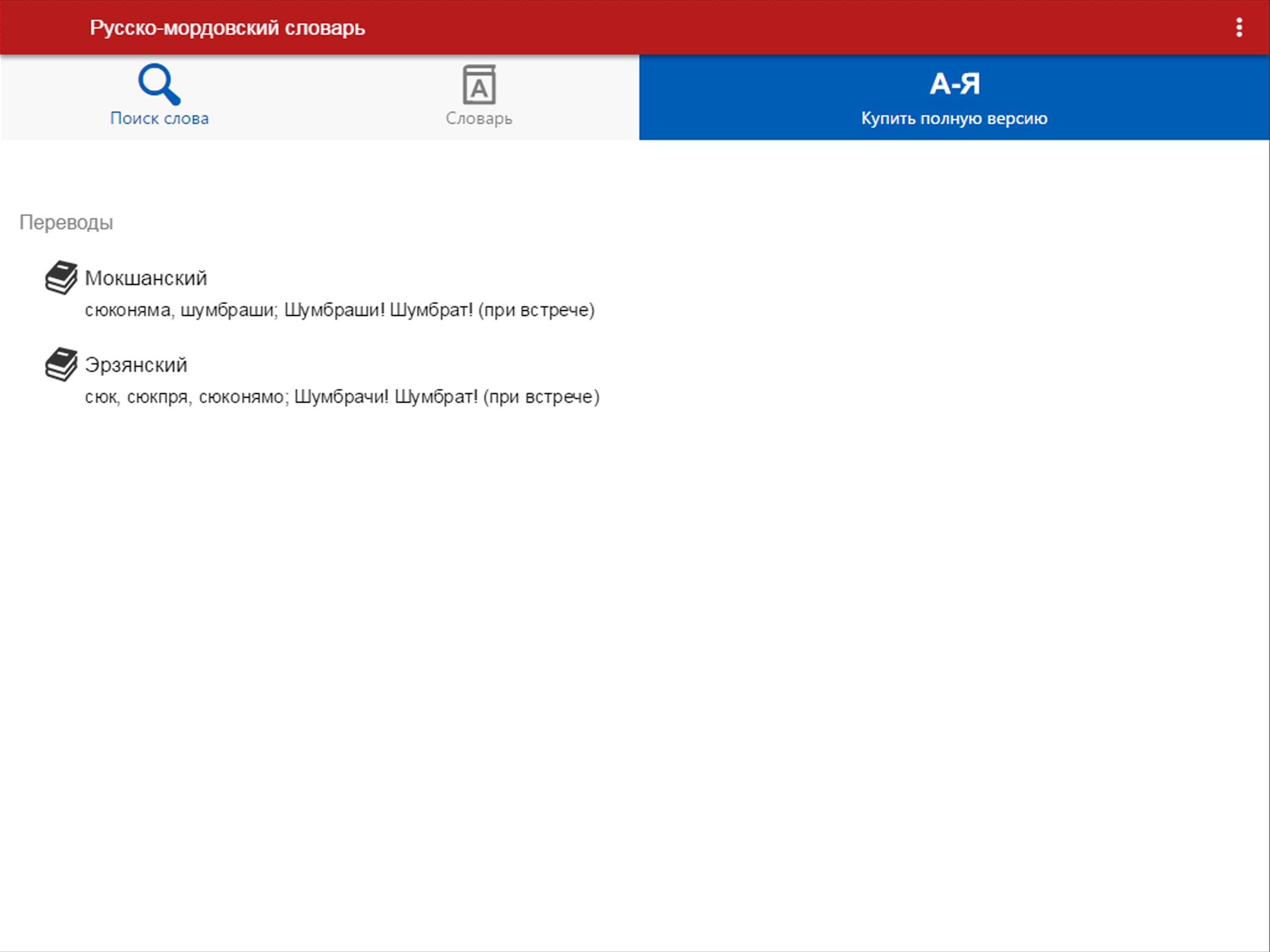 “Russian-Mordovian Dictionary” contains more than 10 thousand words of different topics. With the help of this app you can translate words in Russian into Moksha and Erzya languages.
