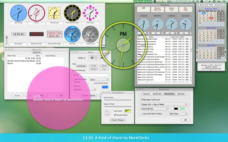Alarms can be used with any clock. More Clocks contains also a perpetual calendar, and a time zones window list. Any of this functionalities are available through the status bar clock icon in the menubar. This icon shows you the time and the presence of alarms. The icon is configurable. Numerical clocks can be presented as 24 hours or 12 hours am/pm clocks. Analog clocks with or without seconds needle.