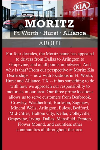 For four decades, the Moritz name has appealed to drivers from Dallas to Arlington to Grapevine, and at all points in between. And why is that? From our perspective at Moritz Kia Dealerships -- now with locations in Ft. Worth, Hurst and Alliance, TX -- it has something to do with how we approach our responsibility to motorists in our area. Our three prime locations allows us to serve customers from Benbrook, Crowley, Weatherford, Burleson, Saginaw, Mineral Wells, Arlington, Euless, Bedford, Mid-Cities, Haltom City, Keller, Colleyville, Grapevine, Irving, Dallas, Mansfield, Denton, Flower Mound, and countless other communities all throughout the area.