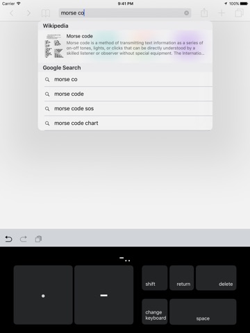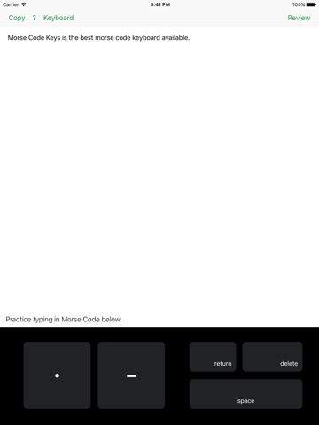 Install the included keyboard and you’ll be able to type in morse code using dits “.” and dahs “-“ in any app on your iPhone or iPad.