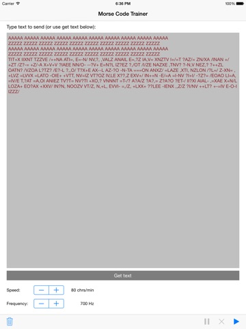 You can type any text and play it in various speeds from 40 to 200 characters per minute. You can also adjust the pitch from 400 to 1000 Hz. If you dont want to type in text you can paste the text from the clipboard. For training you can select one of 24 lessons based on a modified version of the NL method or add random letters, figures, punctuations or a mix of all. The application supports the international Morse code alphabet letters A to Z, figures 0-9 and the punctuation signs ?, !, ,, ., -, (, ), /, %, ", ;, :, =, + and @. Plus special characters Swedish Å, Ä, Ö as well as the German Ü and ß.