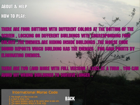 In this game , you eliminate enemies hiding inside buildings using missiles . The morse code reports the targets . The points you get determine your next level .