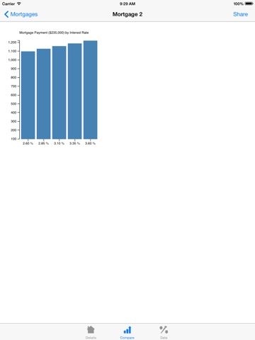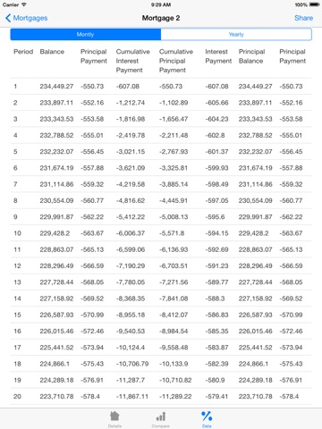 You will be able to instantly compare 5 similar mortgages. It will display monthly payment differences on a table and on a bar chart.