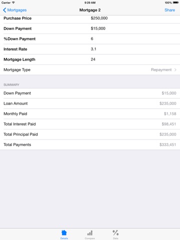Simply change the mortgage details to see all the information about mortgage payments. The summary will give you concise information about the mortgage, such as: down payment, loan amount, monthly payments, total interest paid, total principal paid, and total payments.