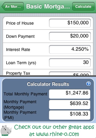 A+ Mortgage Calculator Lite offers 4 different loan calculators in one simple to use applications. In seconds, you will be calculating the monthly mortgage payment on your dream house, figuring out how expensive of a house you can really afford, determining mortgage refinance savings, or just calculating a simple amortization schedule for any loan.