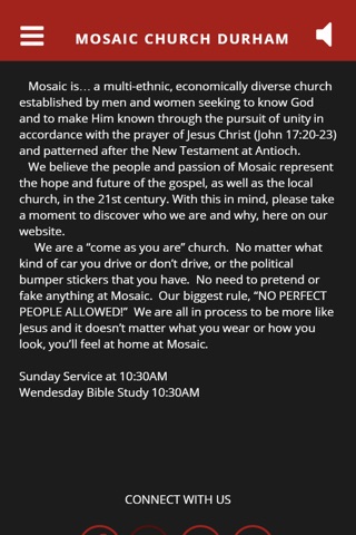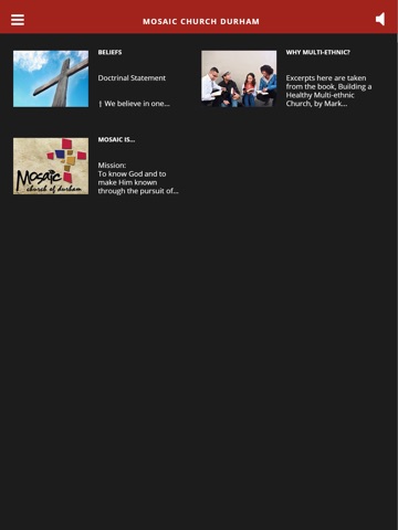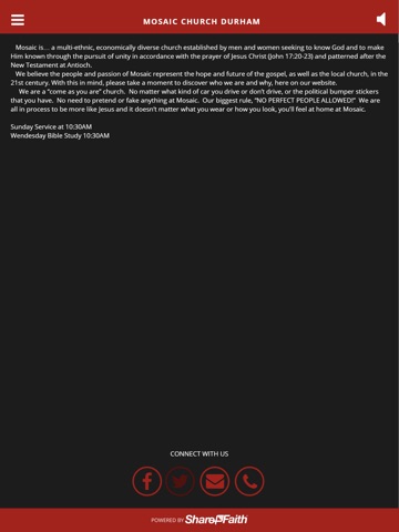 Welcome to the official app of Mosaic Church Durham, NC. Here you can listen to our latest sermon, get directions, or find out more about us. We are a multi-ethnic, economically diverse, community of faith where men and women walk,work and worship God together as one. Join us at 10:30 Sunday mornings for service!