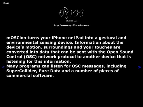 mOSCion turns your iPhone or iPad into a gestural and environmental sensing device. Information about the device’s motion, surroundings and your touches are converted into data that can be sent with the Open Sound Control (OSC) network protocol to another device that is listening for this information.nMany programs can listen for OSC messages, including SuperCollider, Pure Data and a number of pieces of commercial software.