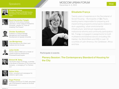 Moscow Urban Forum app has been produced to as guide to the Moscow Urban Forum 2012. It provides full program and description of the Forums events and the latest updates on Moscow Urban Forum news.