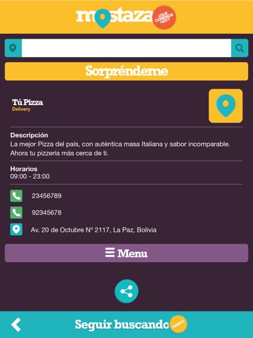 Te invitamos a conocerla es simple, geolocaliza tus antojos, comida y restaurantes en Bolivia, si no conoces una ciudad y estas con ganas de comer algo sólo debes activar MOSTAZA para que te guíe en la elección de la comida o restaurante de tu preferencia. Buen provecho!!!