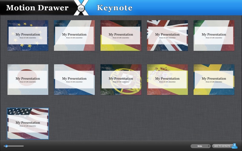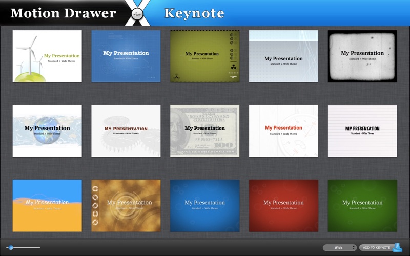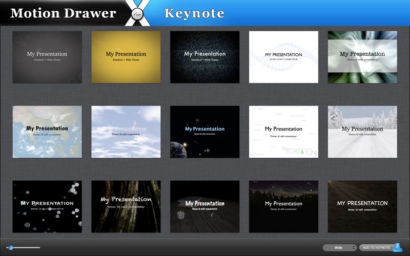 Motion Drawer for Keynote includes 56 standard and 18 wide animated themes for Keynote. Turn your presentation into an imaginative performance. Deliver your message in a lively, flexible and interesting way. Each theme includes high quality and catchy loopable video background. Themes can stand alone to unify a presentation or can be mixed together with other non-motion themes to provide breakpoints.