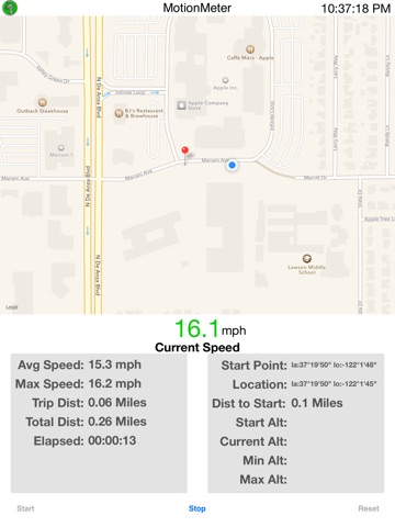 MotionMeter turns your iPhone into a bicycle computer and pedometer. Using the GPS unit, MotionMeter tracks the current, maximum and average speed along with trip and total distance along with elapsed time and direction (if available). With a simple horizontal swipe MotionMeter displays the current and starting coordinates, distance from the start and altitude information. MotionMeter is configurable from your iPhone settings page. It provides for Imperial, Metric, or SI units, and the total distance can be set and reset. A GPS tweaking section allows the user to choose between the built in speed function and a custom speed mechanism specifically designed to work at walking speeds. The custom speed mechanism provides user configurable distance and time filters. Please note this application REQUIRES a gps unit. Continued use of GPS running in the background can dramatically decrease battery life.