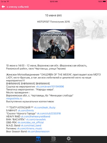 В приложение Мото Афиша собраны интересные события для мотоциклистов (открытия сезона, прохваты, поздки, покатушки и много другое)