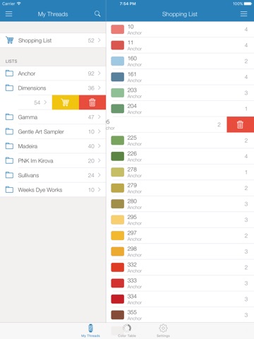 My Threads - program for cataloging your embroidery threads. You can manage lists of threads for specific embroidery or shopping list. You can find the necessary thread by code, name or color. Embroidery color chart (color table) will help you to determine the appropriate thread color or find similar from other manufacturers, such as: Anchor, Dimensions, DMC, Gamma, Gentle Art Sampler, Madeira, PNK im.Kirova, Sullivans, Weeks Dye Works.