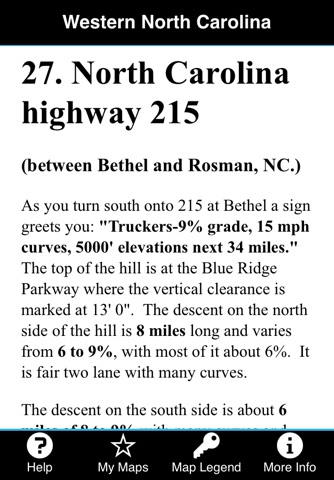 Mountain Directory West includes locations and descriptions of over 400 mountain passes and steep grades in the following states: Arizona, California, Colorado, Idaho, Montana, Nevada, New Mexico, Oregon, Utah, Washington, and Wyoming. Mountain pass locations are marked with a yellow triangle on beautiful color relief maps. Touching a yellow triangle on the screen displays text that describes that location. The text includes how long the grade is, how steep (%) it is, if it is two lane, three lane, or four lane, if it has sharp curves, switchbacks, escape ramps, sharp drop offs, etc.