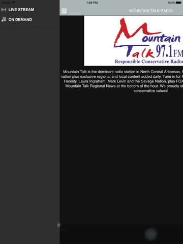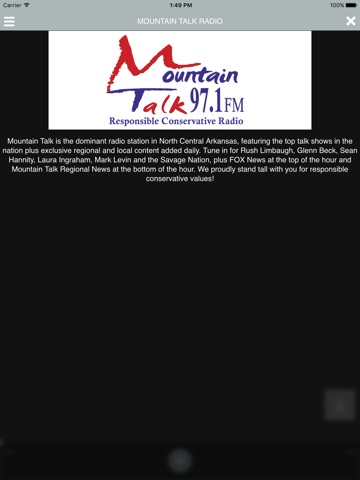 Mountain Talk is North Central Arkansas home of Responsible Conservative Radio, featuring the most powerful, highest quality programming that conservatives want to hear. Glenn Beck, Rush Limbaugh, Sean Hannity, Laura Ingraham, Mark Levin, The Savage Nation, and Alex Jones are featured daily, along with twice an hour news updates from FOX News and Mountain Talk Regional News. There is no comparison - Mountain Talk is the gold standard for conservative talk radio.