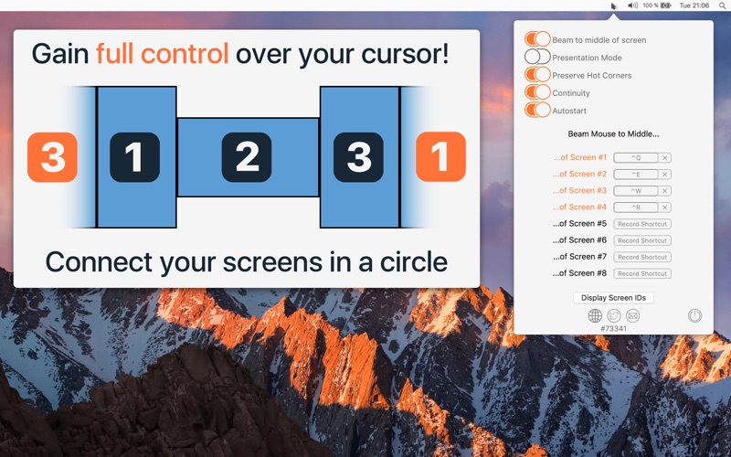 It also moves your cursor to the next screen if it touches your screenedge (optional), assuring a reliable workflow. It enables you to connect your displays in a circle! (optional)