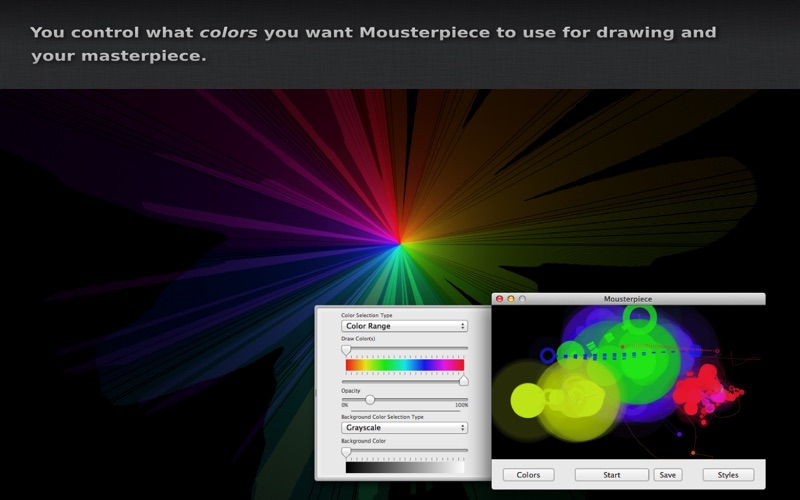 As you work on your Mac, Mousterpiece runs in the background, listening for real-time data about your mouse movements and actions (clicks, drags, and scrolls). This information is used to create a unique masterpiece! Once youre done working, you can save your creation as a PNG, which is automatically sized to your desktop resolution so it can be used as a desktop background!