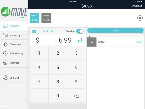 Simple Mobile Checkout – Tap to add items to the Move Mobile register, swipe your customer’s card, and email or text their receipt.