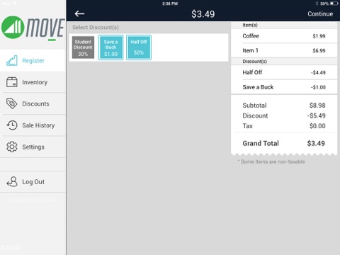 Move Mobile is a complete mobile Point-of-Sale (mPOS) solution allowing small business owners to streamline sales and accept payments on-the-go with a smartphone or tablet device. Use your iOS device to process sales, apply discounts, calculate tips and taxes, email receipts and issue returns and refunds wirelessly. This solution is perfect for boutiques, coffee shops, independent stylists, contractors, daycare professionals, food trucks and more!