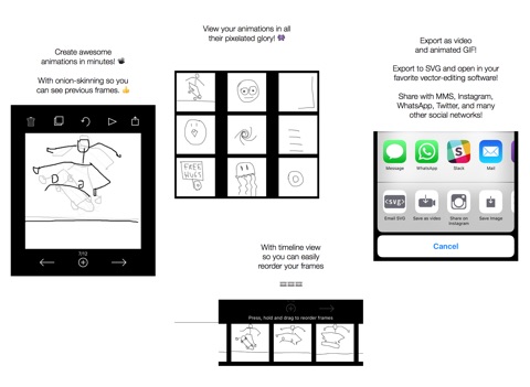 Create flipbook-style animations and export them as animated GIFs, movies, or layered SVGs. Open your drawings in your favorite vector-editing program and let your creations have a new life!