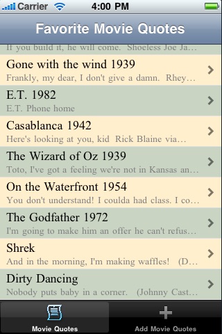 Building the Largest Collection of your favorite Movie Quotes on your iPhone! ADD and VIEW Movie Quotes to our already large collection of Movie Quotes that are added to and updated often.