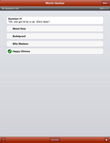 This free app contains a sample quiz which contains some of the most popular questions from each of our movie quote trivia packs and allows you to test out all the features before you purchase the in-app quiz packs.