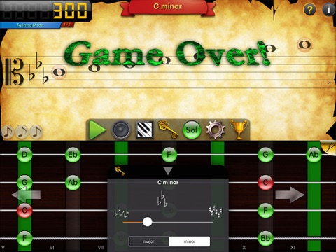 Once the game is started via the toolbar a stream of whole notes comes streaming from the right side of the screen. These notes have to be named in the order of their appearance with the current input instrument (i.e. Viola). Once a note gets too close to the clef on the left side of the screen it disappears in a cloud of vapor and the player loses one life. For each note named in time the player gets one point or more depending on level. The further the game progresses the more notes will appear in this steady stream and their range will widen to potentially include many ledger lines above and below the staff. Once a player has depleted all his lives the game is over and he might receive a high score.
