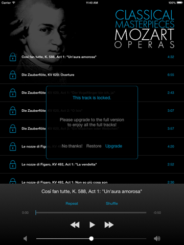The Classical Masterpieces: Mozart Operas collects the Composer’s most popular and best-known overtures and arias to a simple, easy to use iPhone and iPad optimized interface. 11 tracks of the greatest performers from one of the greatest masters of music history.
