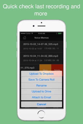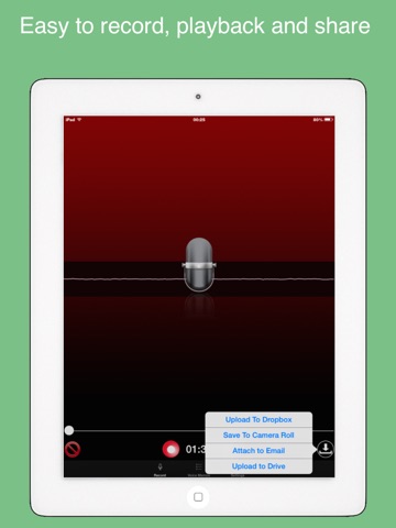 - Back-up recordings to Dropbox, Camera Roll, Google Drive, Email