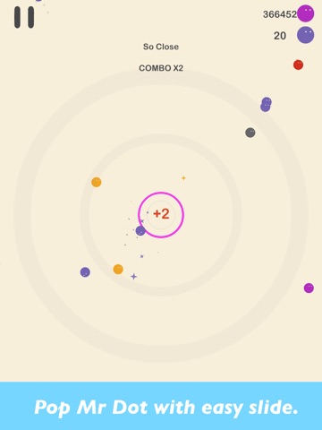 With a simple slide, you can control Mr Dot to move on the circle and fire to pop other dots.Remember not to shoot the skull,nor let other dots touches the circle.