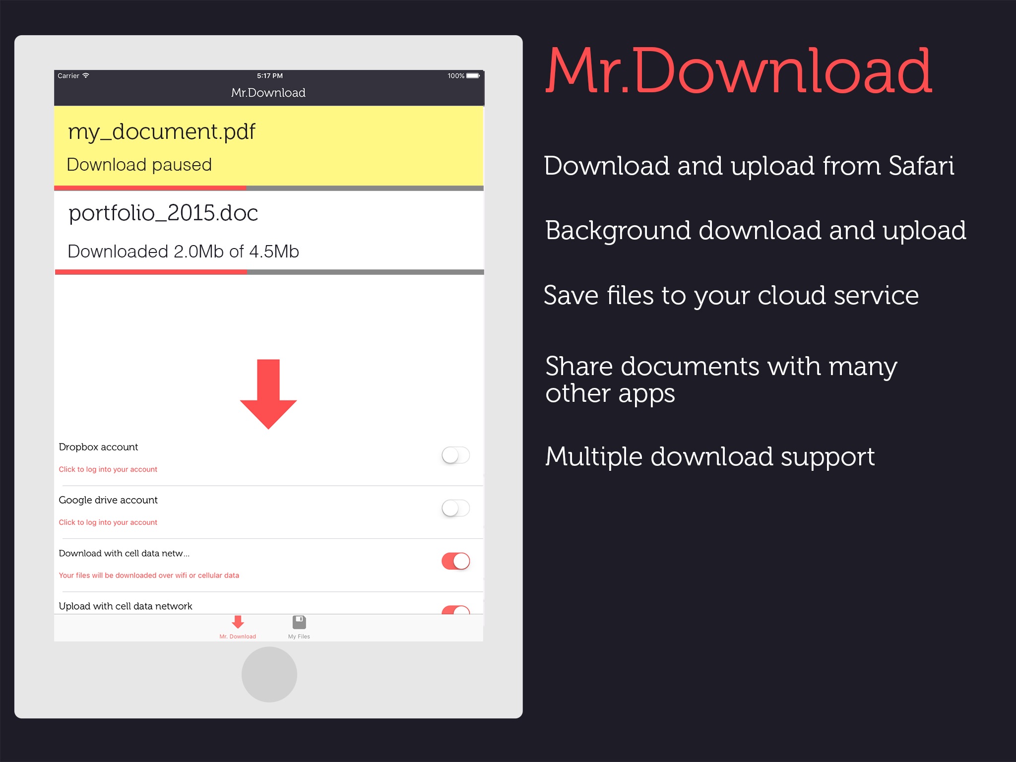 Mr.Download is a fully featured download manager that allows you to download files to your device directly from Safari or many other apps supported.
