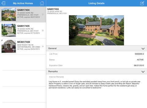 As an MRIS subscriber, simply log in with your MRIS ID and password to use the app. After logging in, you will see the My Active Homes page, which displays your on-market Residential listings in the same order as the desktop version of Keystone (Rented, Sold, Expired and Withdrawn listings are not displayed). You will see the same listing alerts that are displayed in Keystone. You can also save changes to your Work Area for up to 60 minutes.