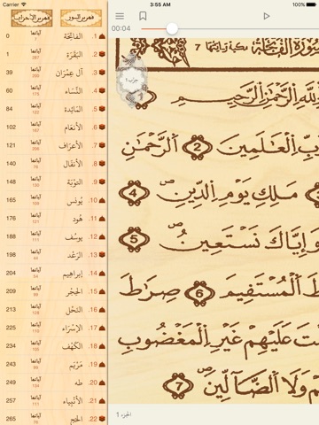 - Easy selection of Sûra or the parts of each Hizb: Half hiz (1/2), Rubu (1/4), or Thumun (1/8) thanks to the correspondent index (menu).