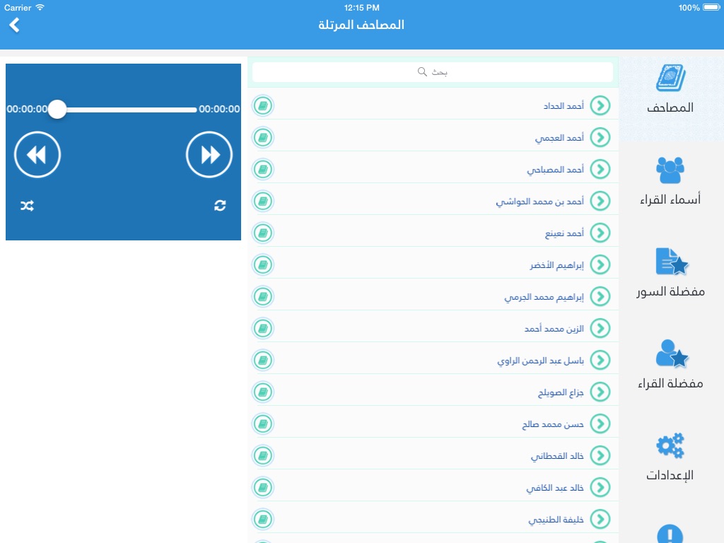 تطبيق مصاحف موسوعة صوتية لتلاوات القرآن الكريم تضم العشرات من مشاهير القراء برواية حفص عن عاصم وورش عن نافع وقالون عن نافع وغيرها، كما يضم تلاوات مجودة وتلاوات مترجمة لعدد كبير من اللغات الأجنبية (الانجليزية والفرنسية والأوردية والاندونيسية وغيرها).