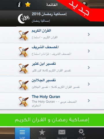 امساكية رمضان مجانية بعد شراء التطبيق ، القران الكريم و تفسير ابن كثير والجلالين و ترجمة القران يجب تفعيلها و فتحها كلها بسعر ٢ دولار فقط داخل التطبيق