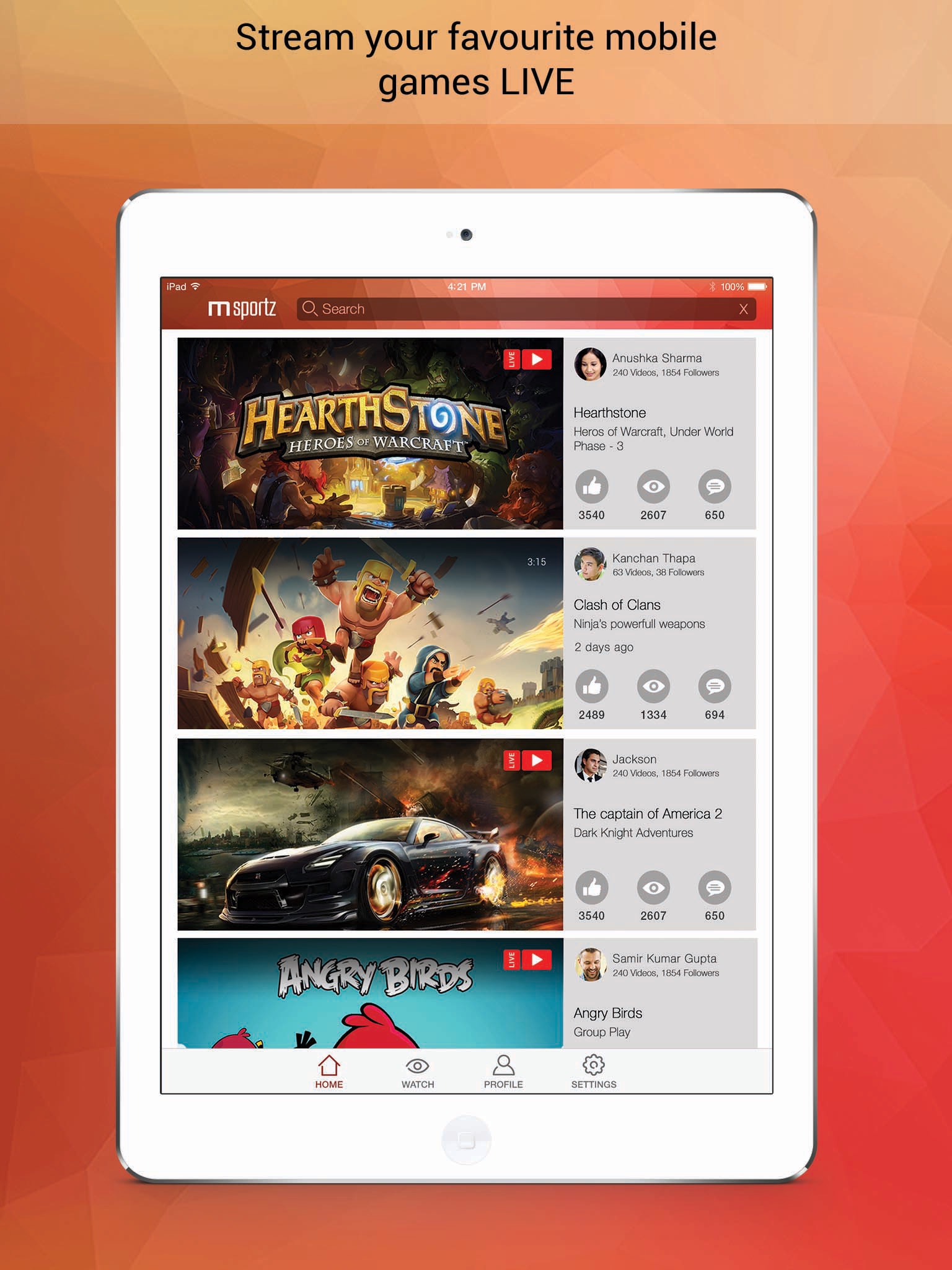 mSportz iOS platform enables user to view live and recorded gameplay, aiming to connect the world’s 1 billion mobile gamers. mSportz is redefining the mobile experience by enabling user to view live or recorded game play broadcasted from other platform via phone or tablet to any other smart mobile device in the world. Starting with mSportz, our range of products will help shape the future of mobile gaming live streaming and mobile eSports