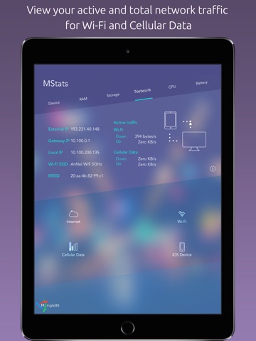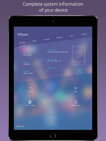View all necessary information about your device and its network connections (Wi-Fi, Cellular Data, Cellular carrier) in a beautiful and unique animated manner and how to optimise your device use.