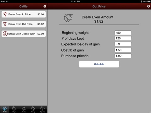 Be more knowledgeable when making livestock purchases and sales. This is a quick and easy decision tool at your fingertips. With just a few bits of information about your livestock you can know the minimum price that will put you in the black (profitable) and keep you out of the red. The Break Even Application will calculate the break even price for livestock given three different break-even scenarios: In Price, Out Price, and Cost of Gain.