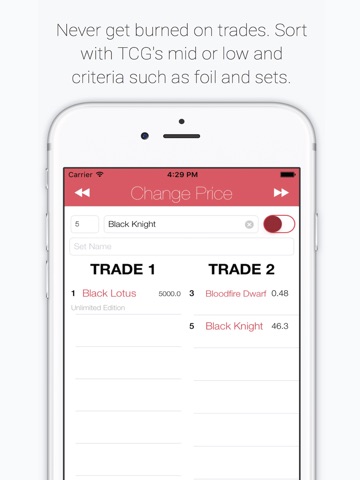 • We’ve all been burned on trades before. Now you don’t have to be! Just whip out the trade portion of the app and make sure you never get burned again. Prices pulled from TCGPlayer’s Mid Price every time you’re online (including foil and specific sets)! Stop getting burned on those price spikes and get the most of your cards!