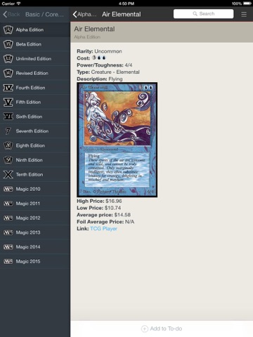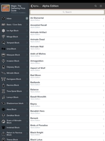 This app is a pricing guide for the Magic: The Gathering card game. It features cards from all standard blocks from Alpha and Beta through the most current sets and many expansions such as Legends, Conspiracy, and From the Vault. This app contains all card information OFFLINE, meaning that you don’t have to have an internet connection to view card or pricing information. Content is updated once daily, and after the update downloads, you do not need an internet connection to view the information. This means that you can use the app in places where you don’t get an active cell signal (like your local game store, a friend’s house, or tournament space).