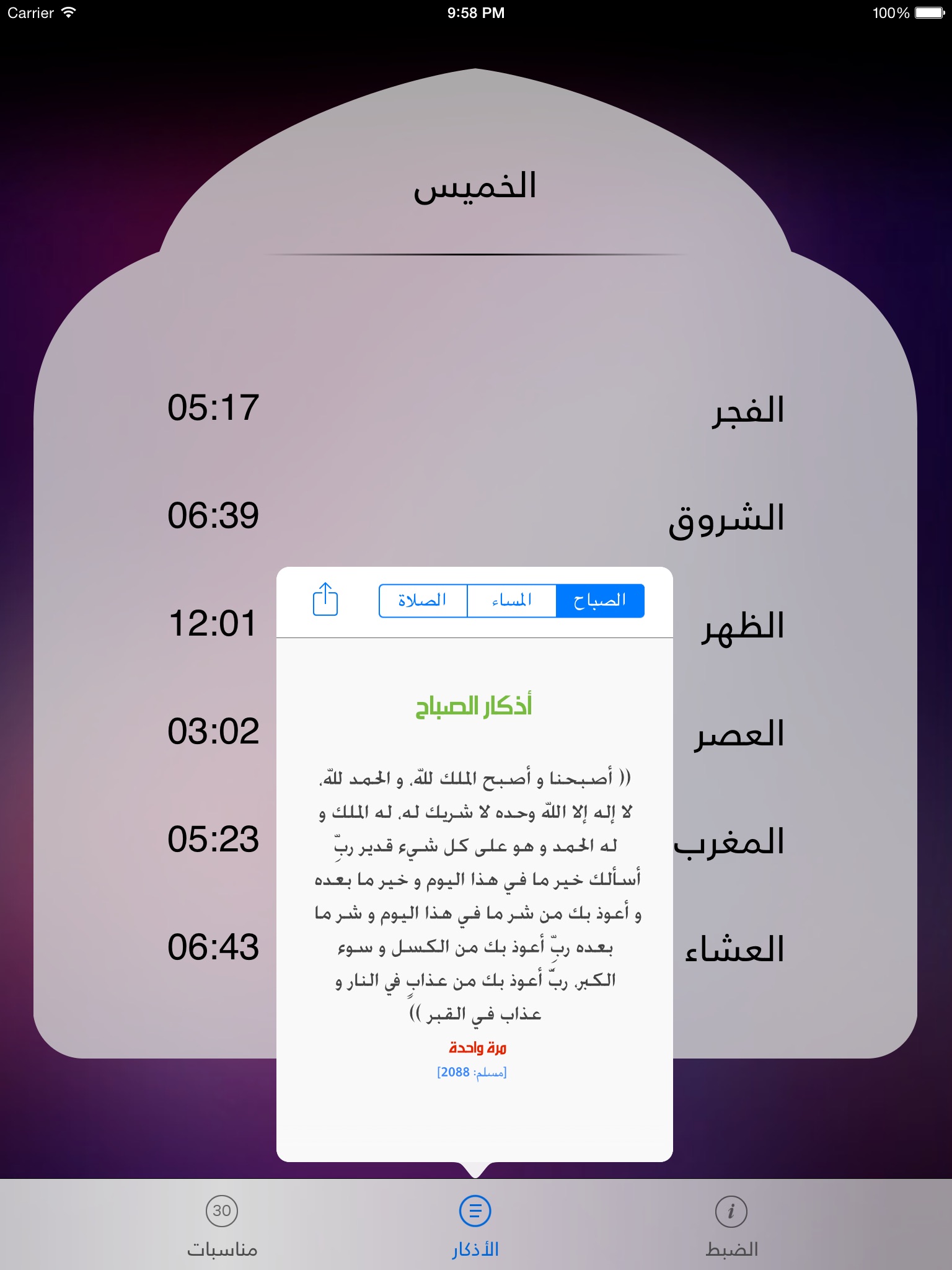 تنبيه التسبيح والاستغفار والصلاة على النبي - صلى الله عليه وسلم - وغيرها في أي وقت تحدده طوال اليوم.